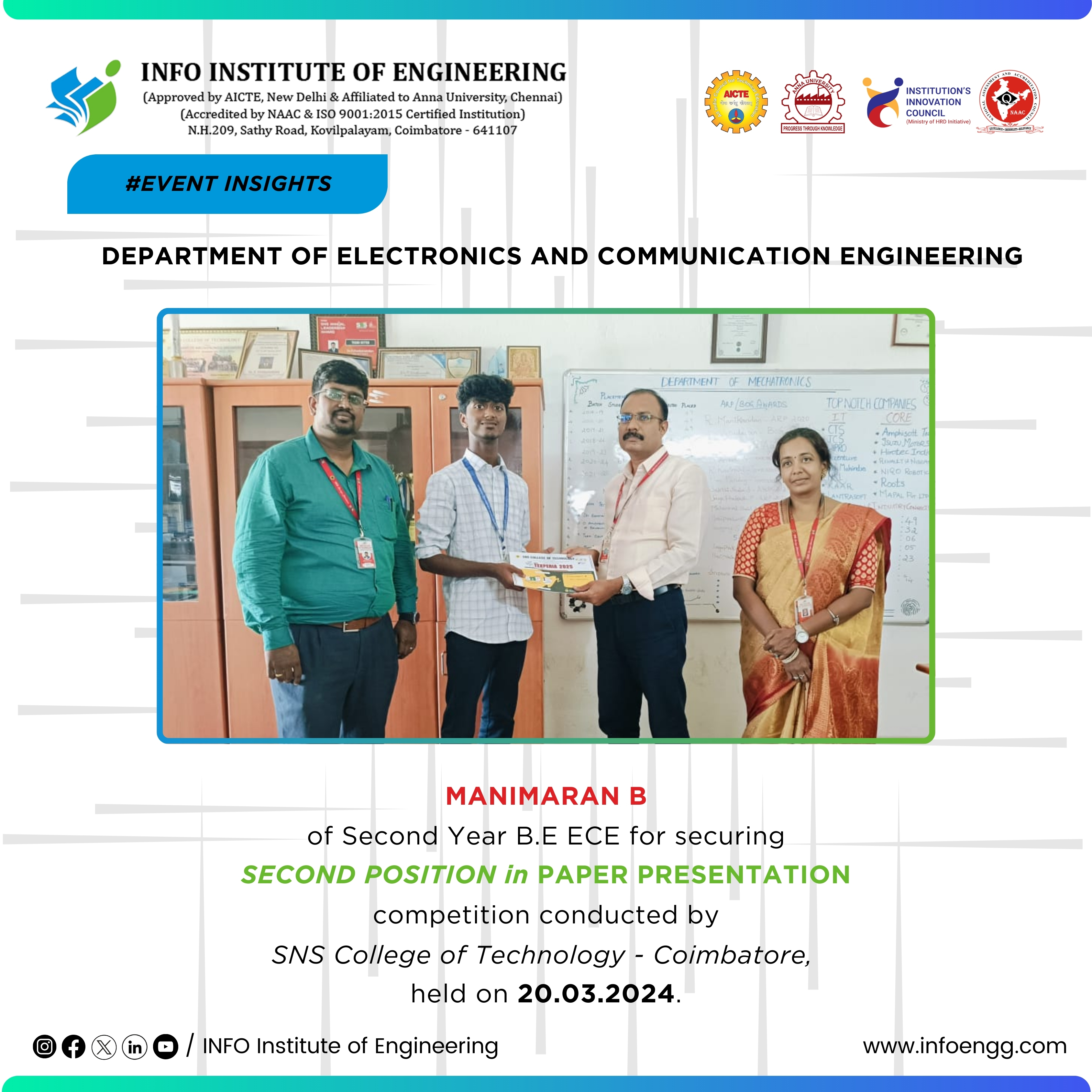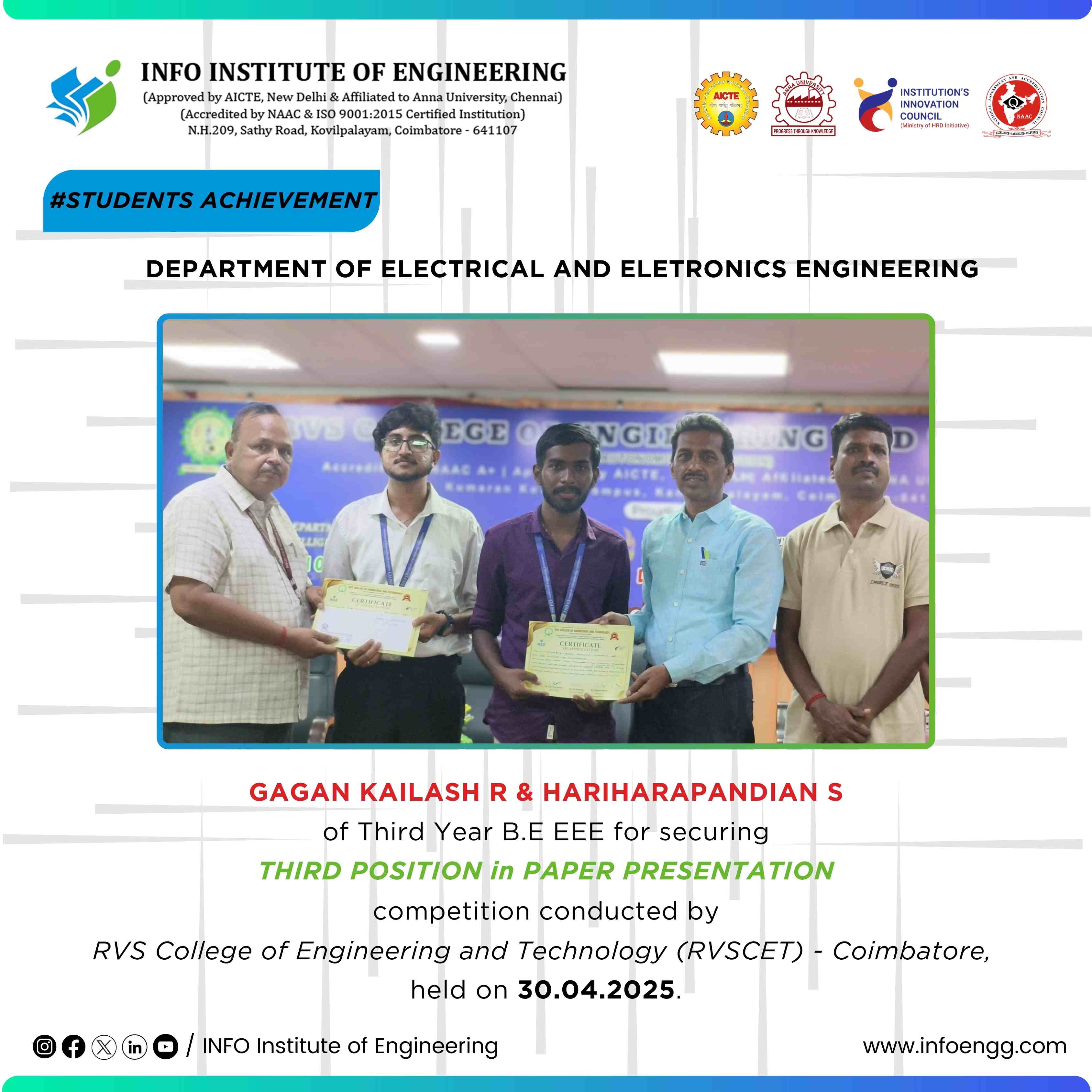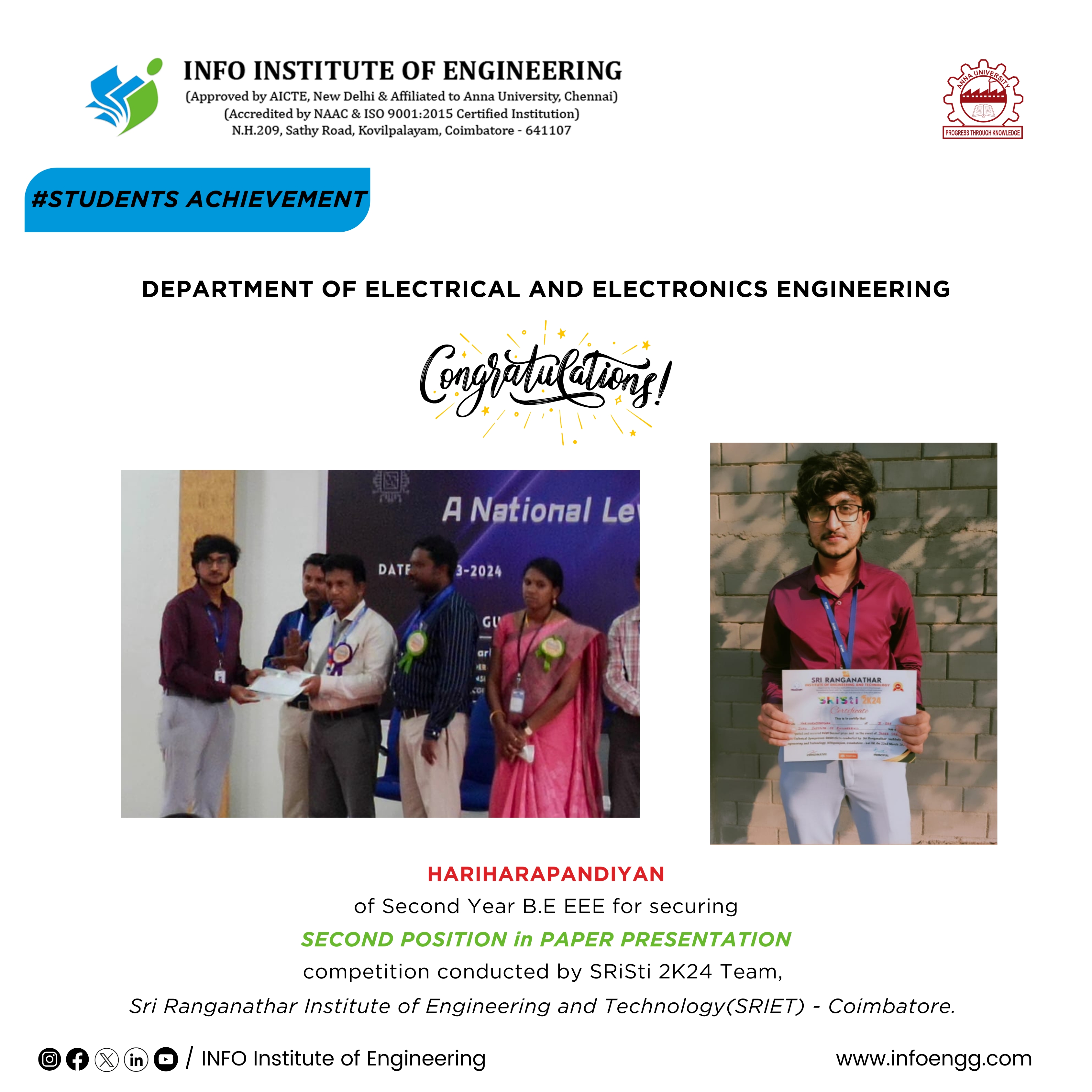.We're excited to announce that our student, HARIHARAPANDIYAN (II year EEE), demonstrated exceptional academic prowess by participating in SRiSti 2K24, a National Level Technical Symposium, and securing the second position in Paper Presentation at Sri Ranganathar Institute of Engineering and Technology(SRIET), Coimbatore. Congratulations to HARIHARAPANDIYAN!