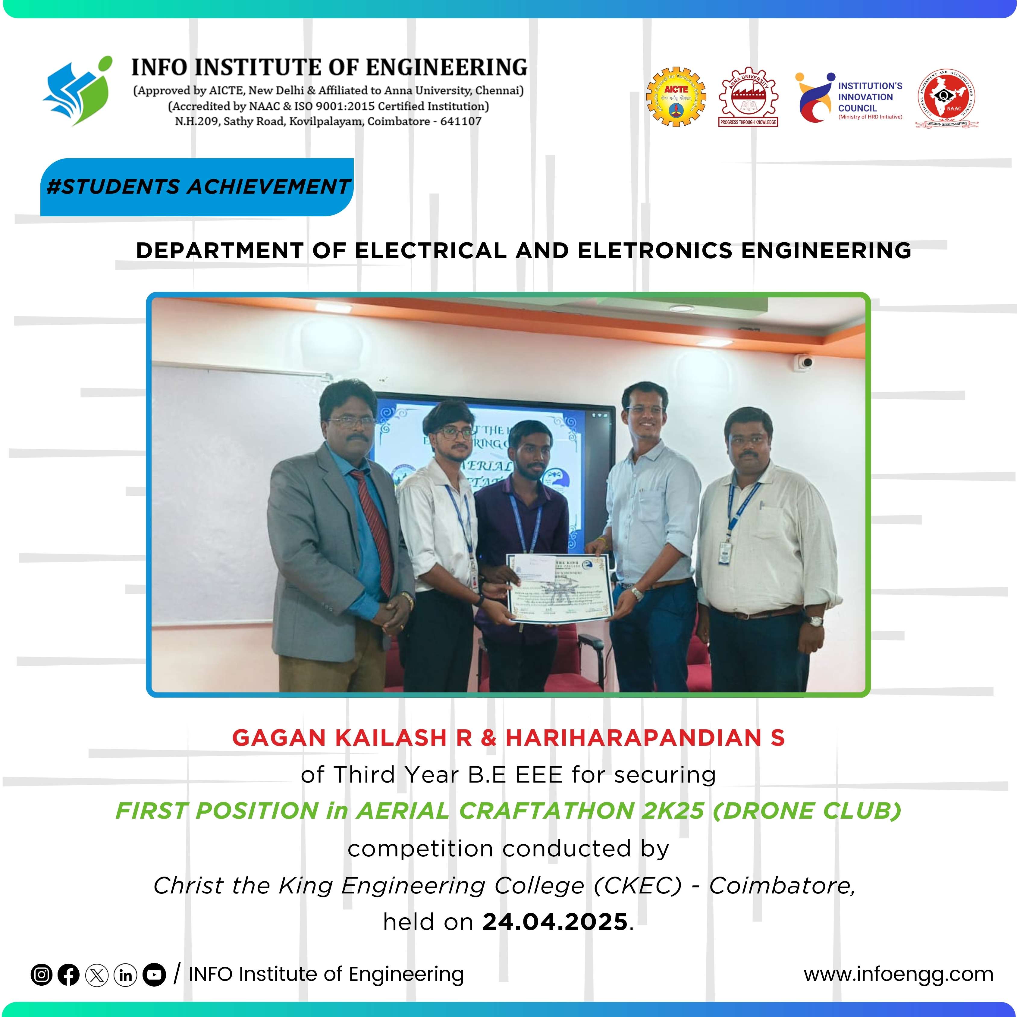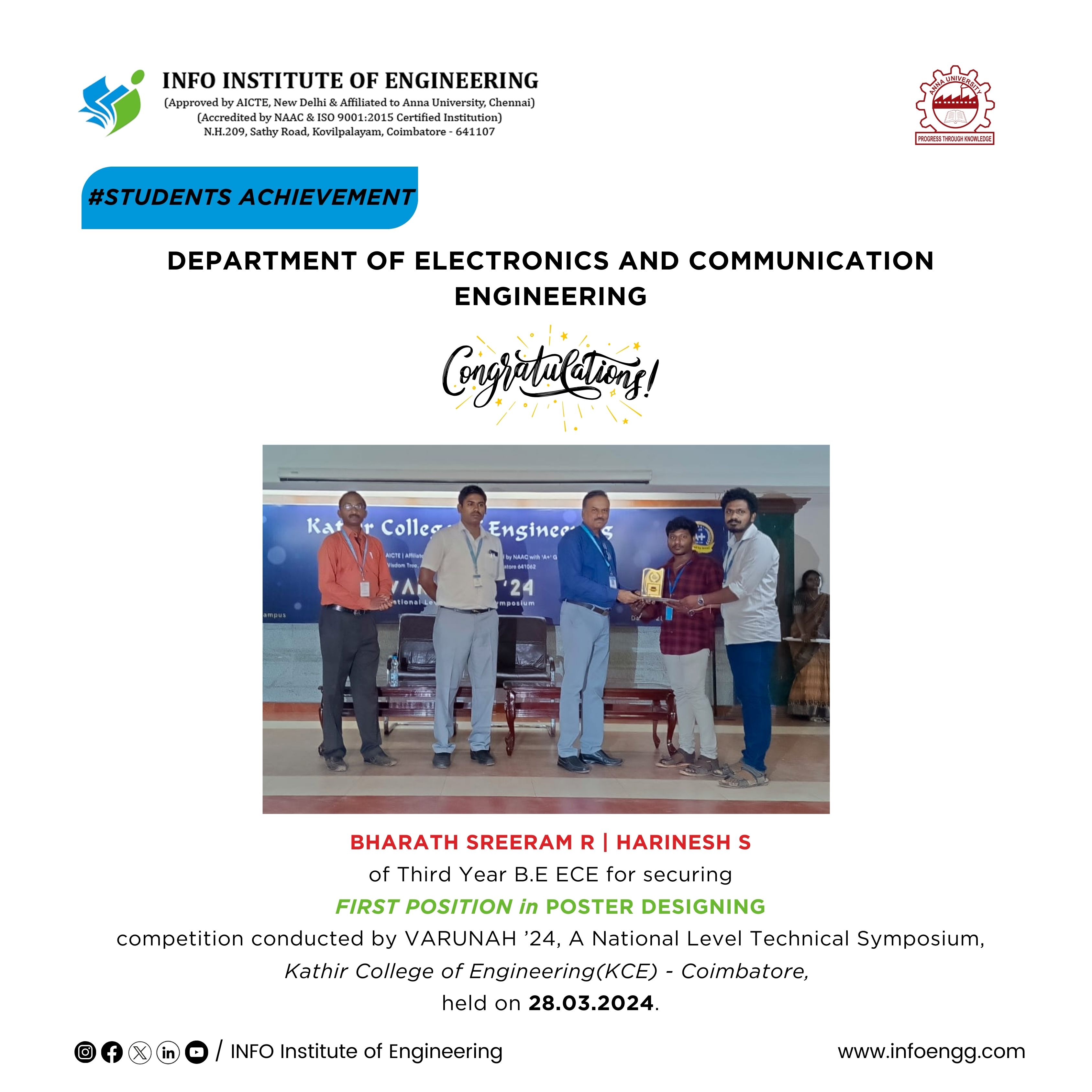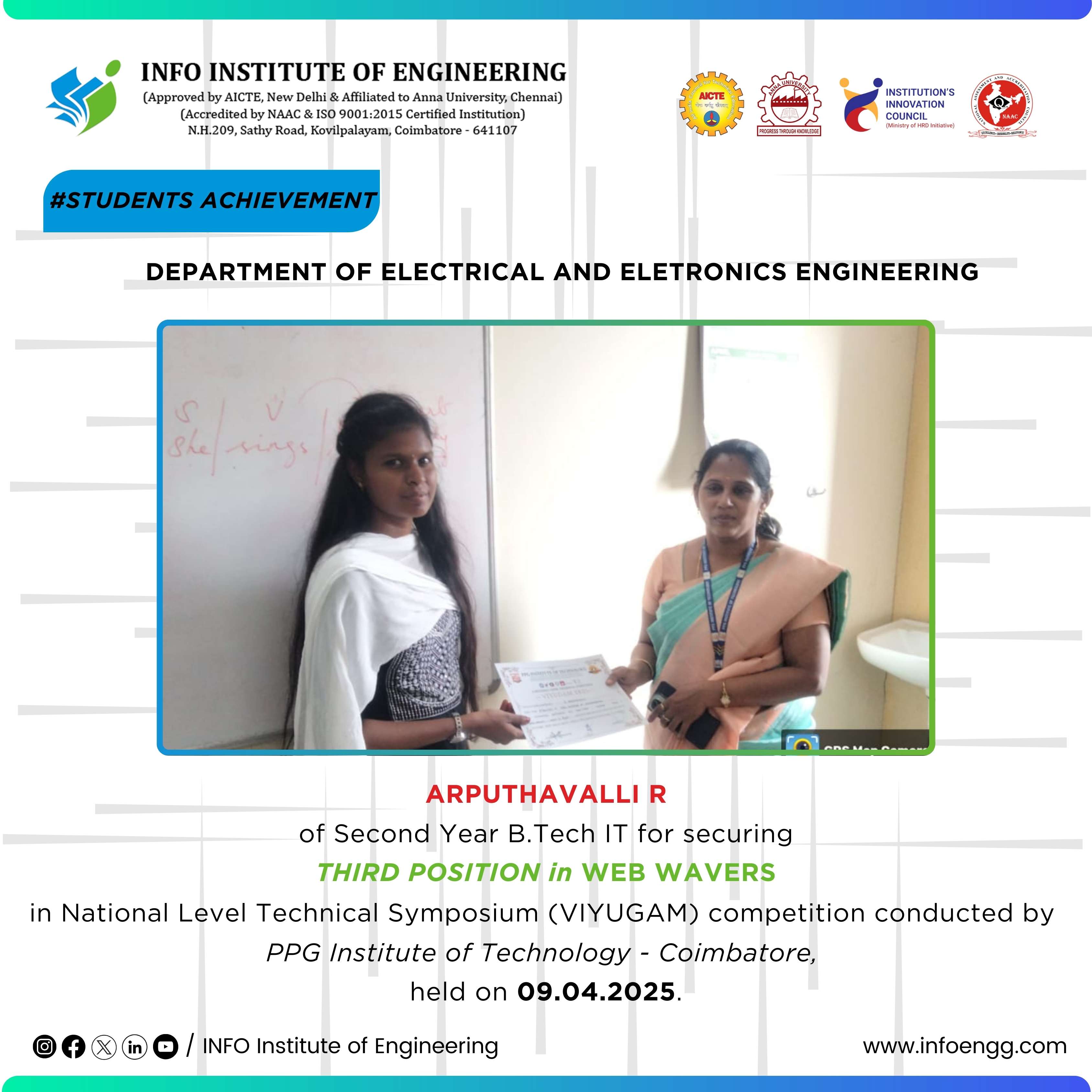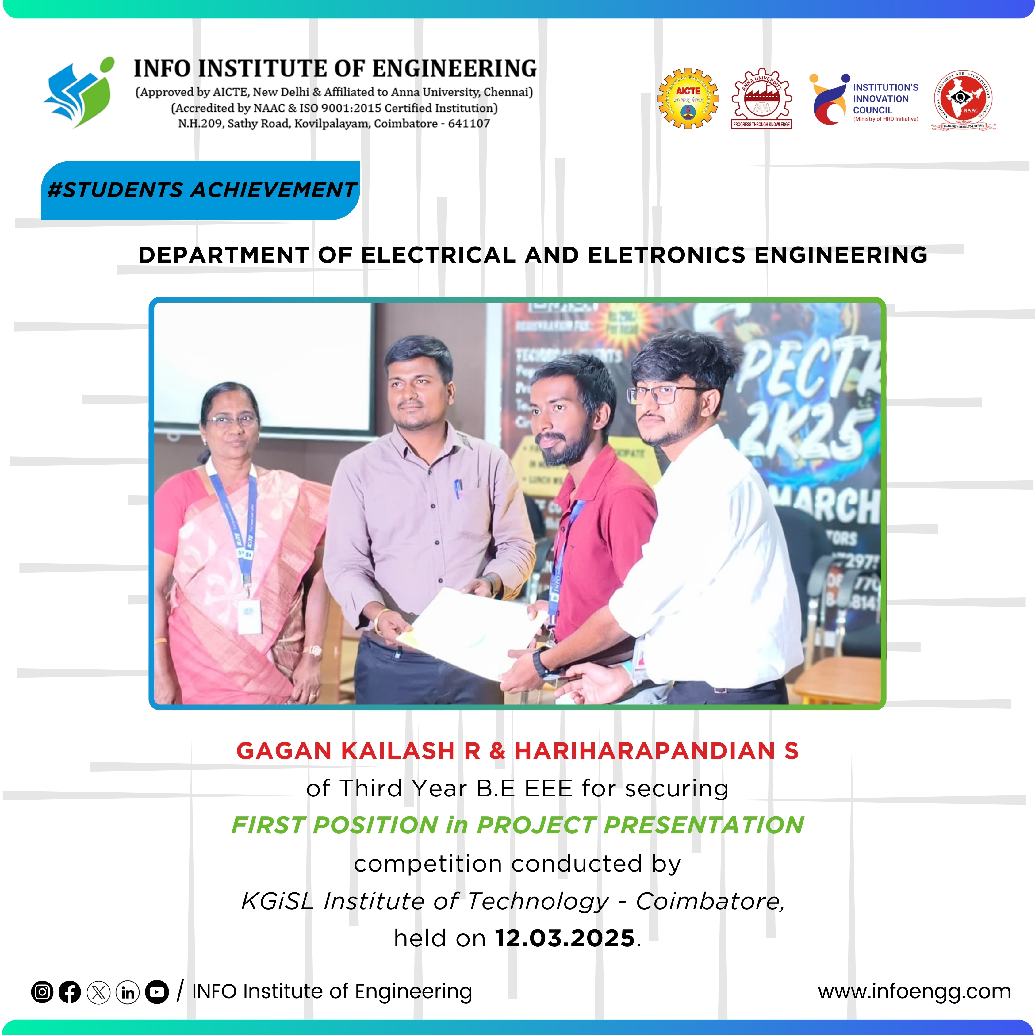 .We're excited to announce that our student, HARIHARAPANDIYAN (II year EEE), demonstrated exceptional academic prowess by participating in SRiSti 2K24, a National Level Technical Symposium, and securing the second position in Paper Presentation at Sri Ranganathar Institute of Engineering and Technology(SRIET), Coimbatore. Congratulations to HARIHARAPANDIYAN!