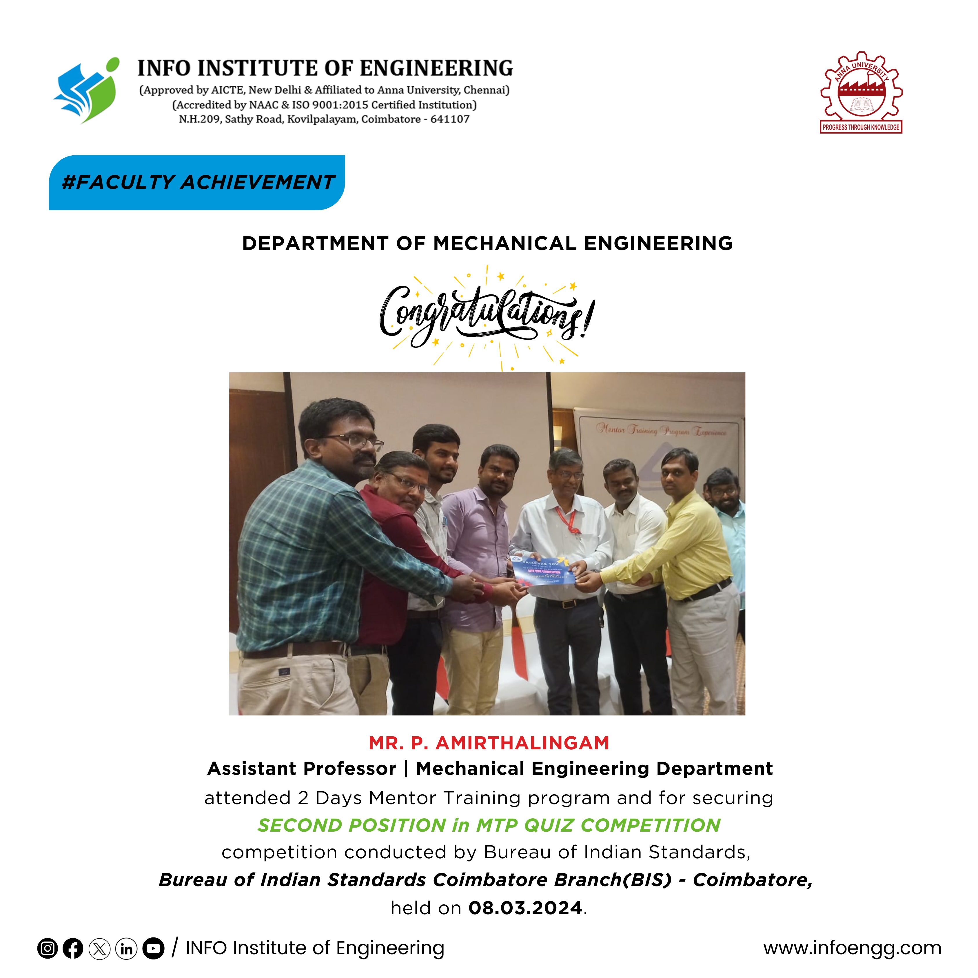 .We're thrilled to announce that Mr. P. AMIRTHALINGAM, an Assistant Professor in the Mechanical Engineering Department, attended a 2-day Mentor Training program and secured the SECOND POSITION in the MTP QUIZ COMPETITION conducted by the Bureau of Indian Standards, Coimbatore Branch (BIS). Congratulations to Mr. P. AMIRTHALINGAM on this outstanding achievement!