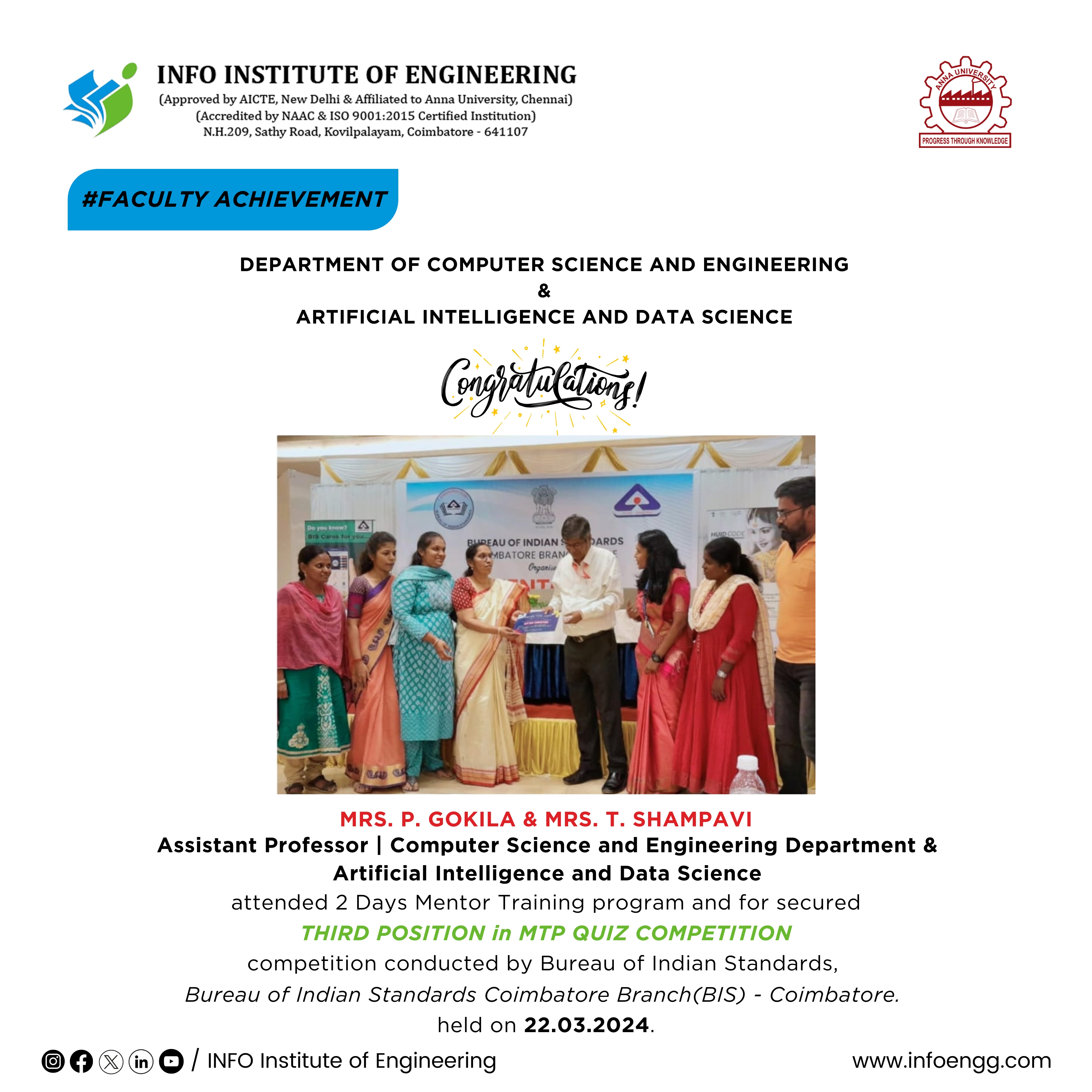 .Mrs. P. GOKILA & Mrs. T. SHAMPAVI, Assistant Professors in the Computer Science and Engineering Department & Artificial Intelligence and Data Science, attended a 2-day Mentor Training program and secured the THIRD POSITION in the MTP QUIZ COMPETITION conducted by the Bureau of Indian Standards, Coimbatore Branch (BIS). Congratulations to Mrs. P. GOKILA & Mrs. T. SHAMPAVI on this achievement!