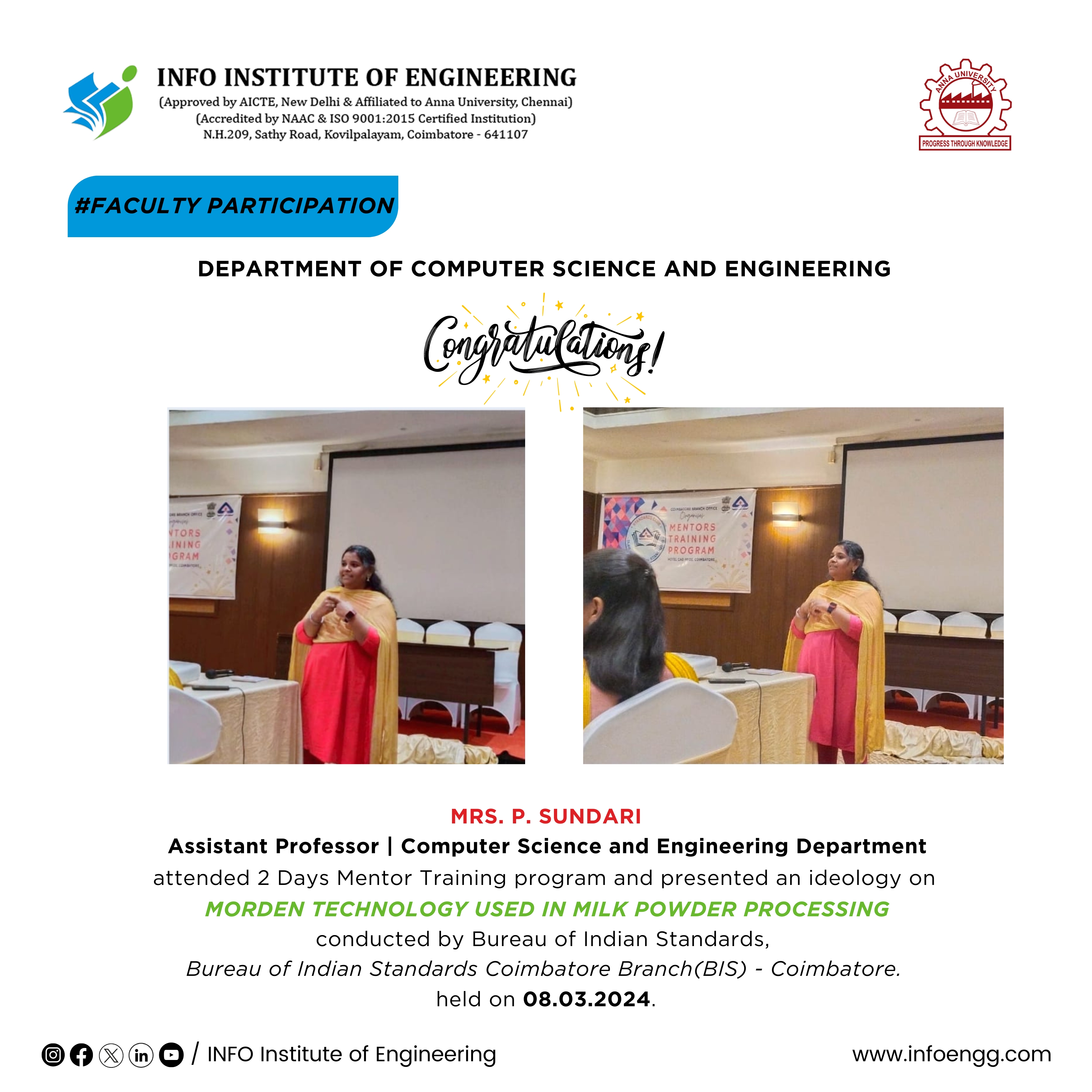 .Mrs. P. Sundari, Assistant Professor in the Computer Science and Engineering Department, attended a 2-day Mentor Training program and presented an ideology on "Modern Technology used in Milk powder processing" conducted by the Bureau of Indian Standards, Coimbatore Branch (BIS). Congratulations to Mrs. P. Sundari on this insightful presentation