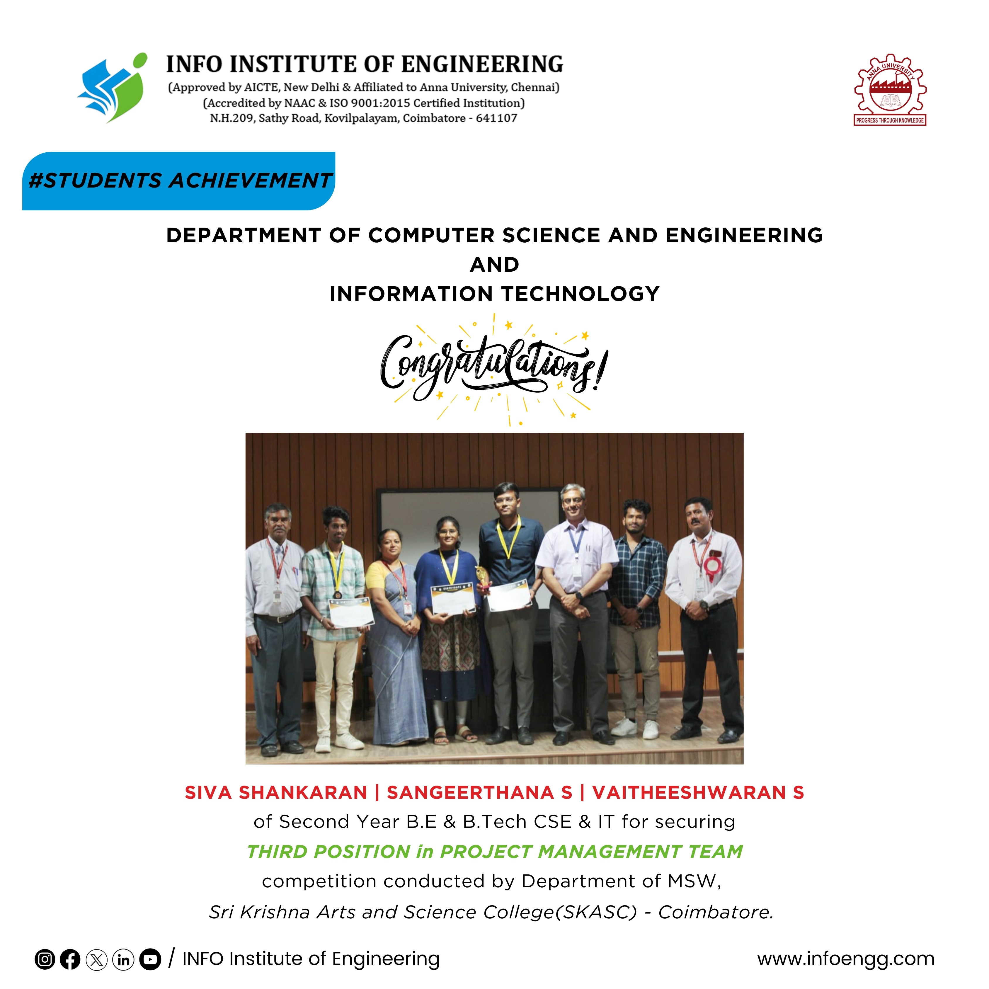.We're excited to announce that our students, Vaitheeshwaran. S (II year CSE), Sivashankaran.R (II Year IT), and Sangeerthana.S (II Year CSE), clinched the 3rd prize in the PROJECT MANAGEMENT TEAM competition organized by the Department of MSW at Sri Krishna College of Arts and Science, Coimbatore. Congratulations to the team!