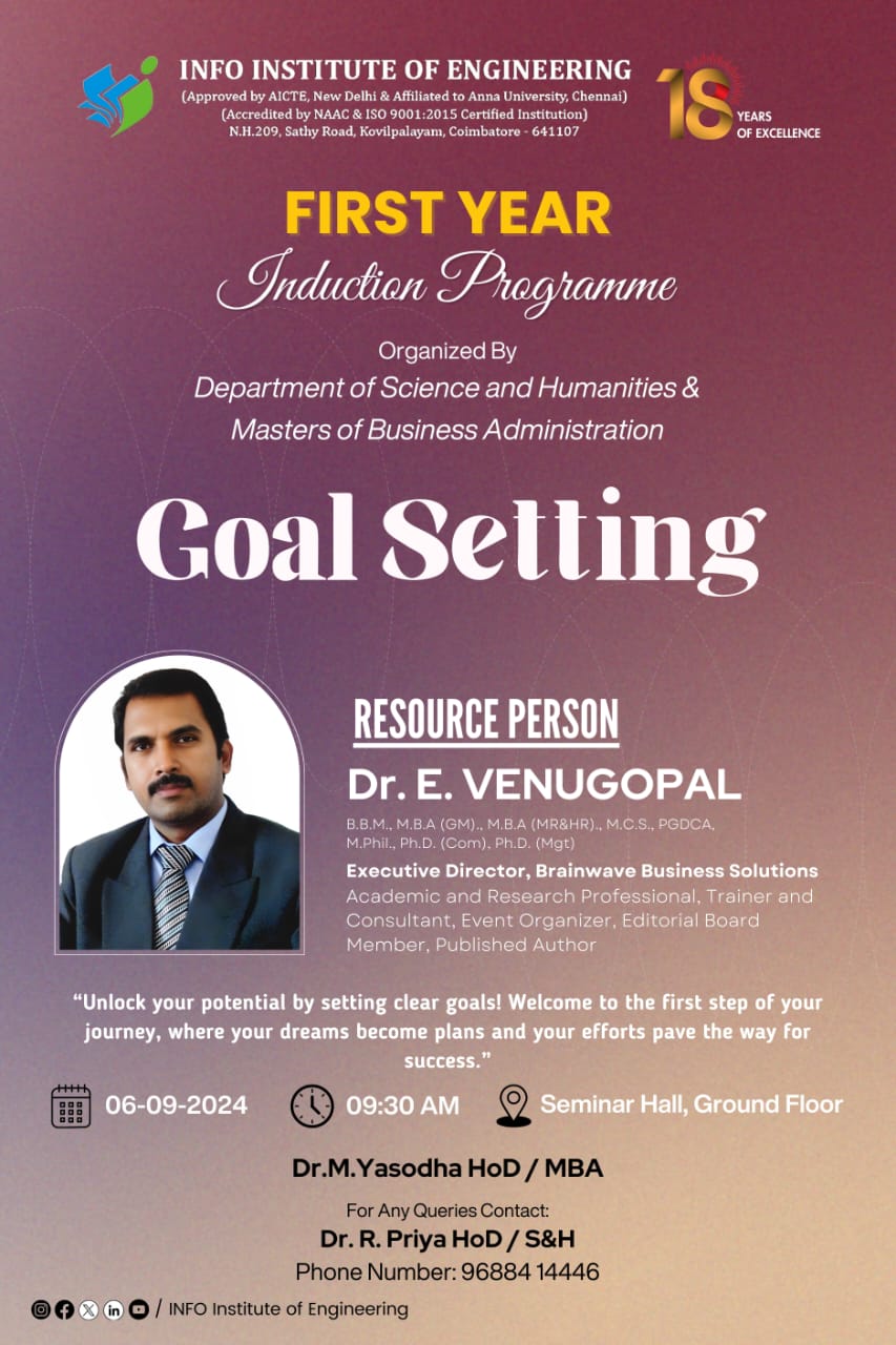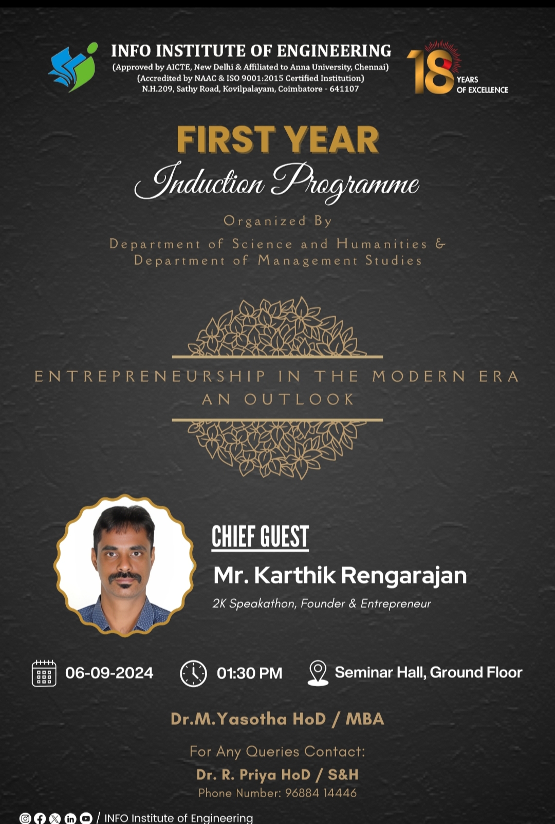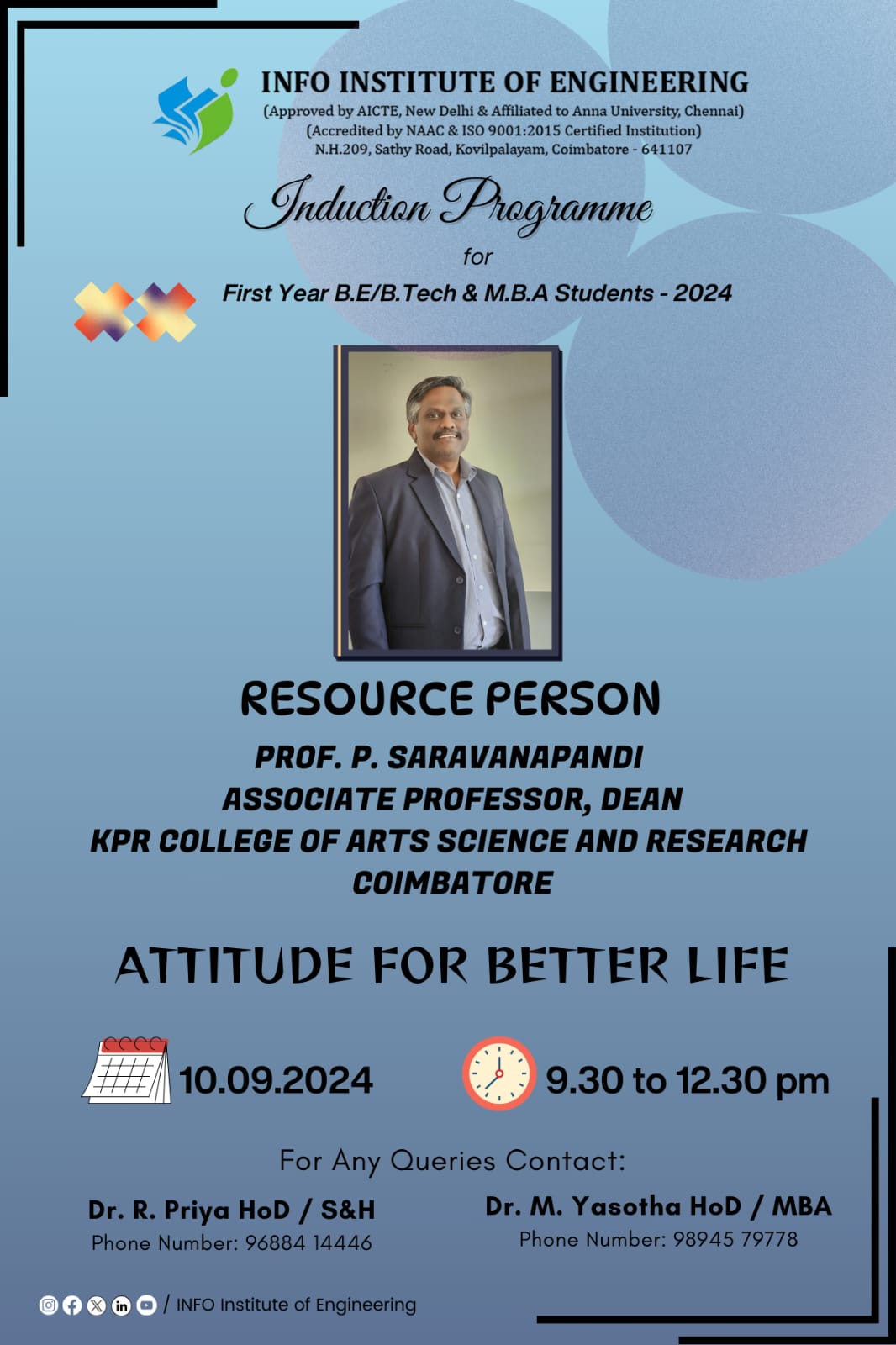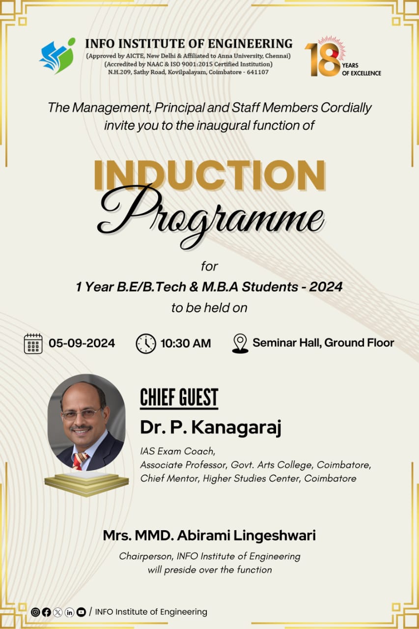At INFO Institute of Engineering, we believe that perseverance is the key to unlocking success. As part of the Induction Programme for First Year B.E./B.Tech & M.B.A Students – Batch 2025, we proudly present a motivational session on “Keep Going.”