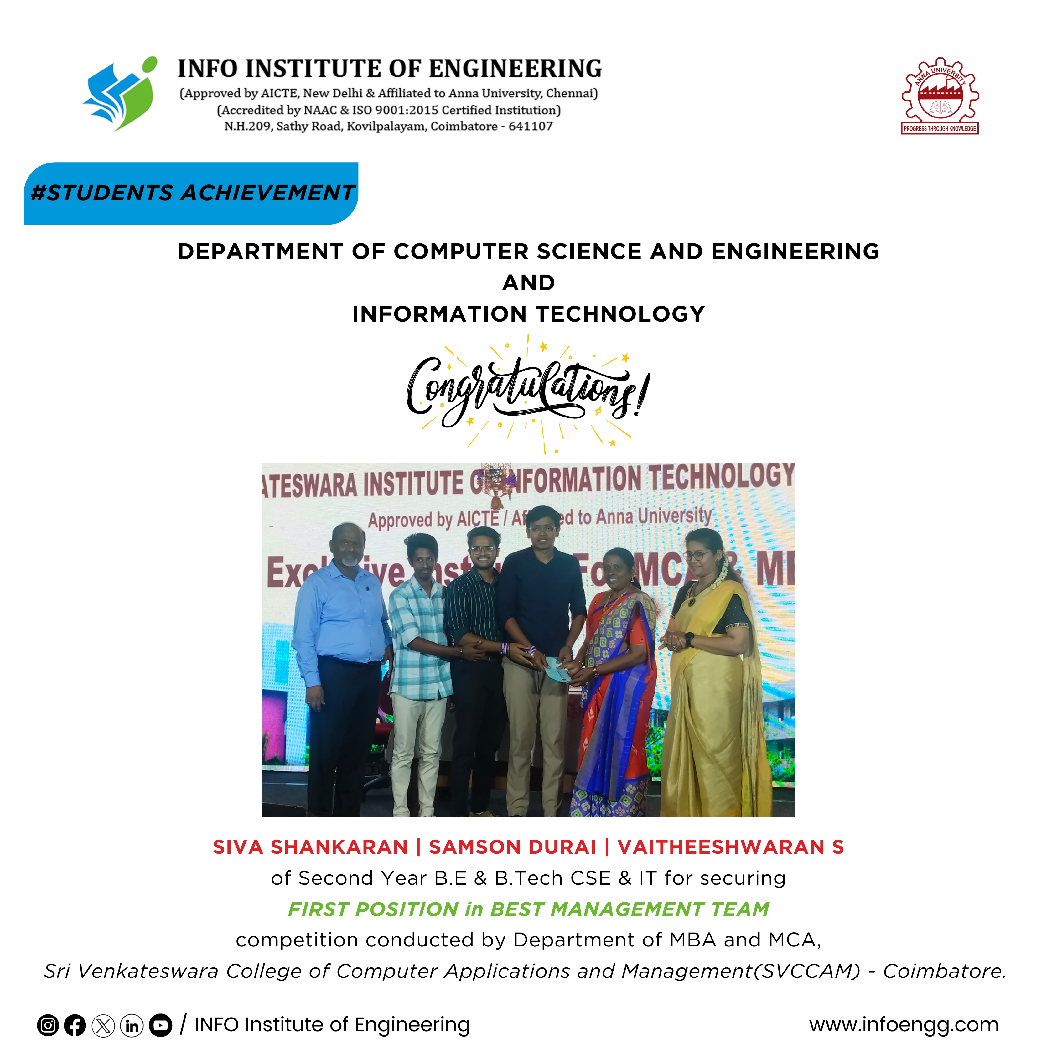 .We're thrilled to announce that our students, Vaitheeshwaran. S (II year CSE), Sivashankaran.R (II Year IT), and Samson Durai (II Year IT), participated and emerged victorious, securing the 1st prize in the BEST MANAGEMENT TEAM competition at Sri Venkateswara College of Computer Applications and Management, Coimbatore. They also received a cash prize worth INR 8K. Congratulations to the team!