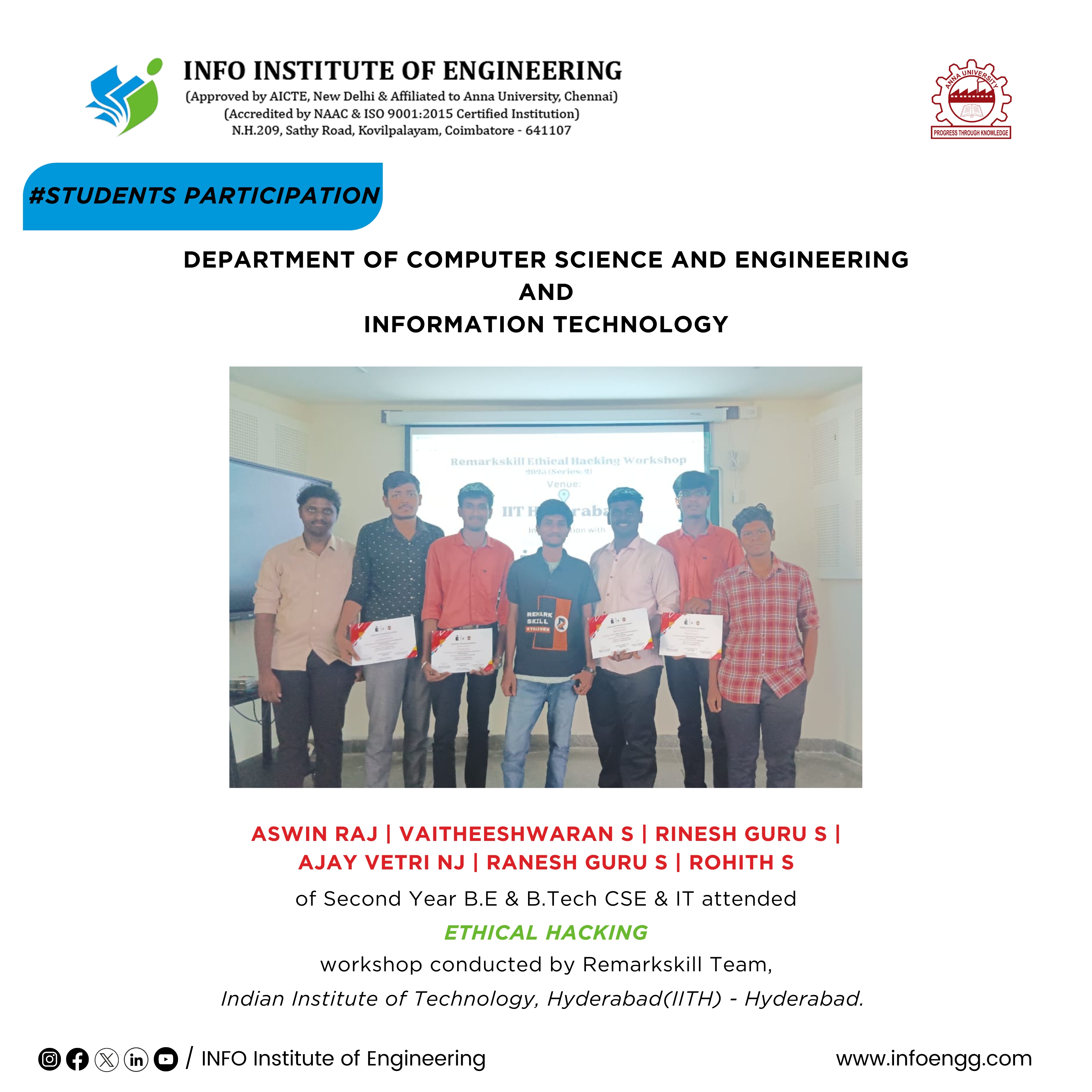 .We're excited to announce that our students, Aswin Raj (II year CSE), Vaitheeshwaran. S (II year CSE), Rinesh Guru S (II Year IT), Ajay Vetri NJ (II Year IT), Ranesh Guru S (II Year IT), and Rohith S (II year CSE), participated in an Ethical Hacking workshop organized by the Remarkskill Team at the Indian Institute of Technology, Hyderabad. Our heartfelt congratulations to the team!