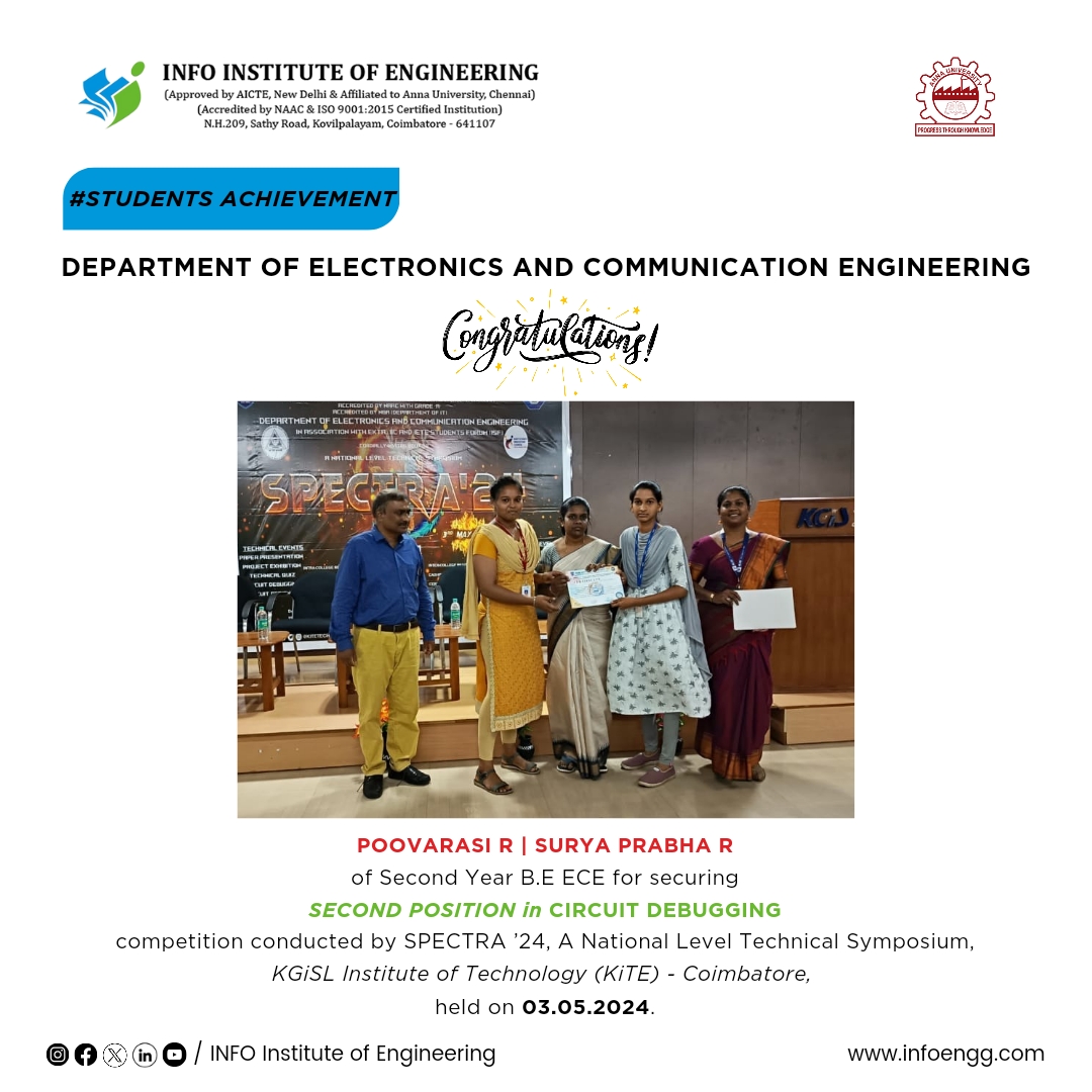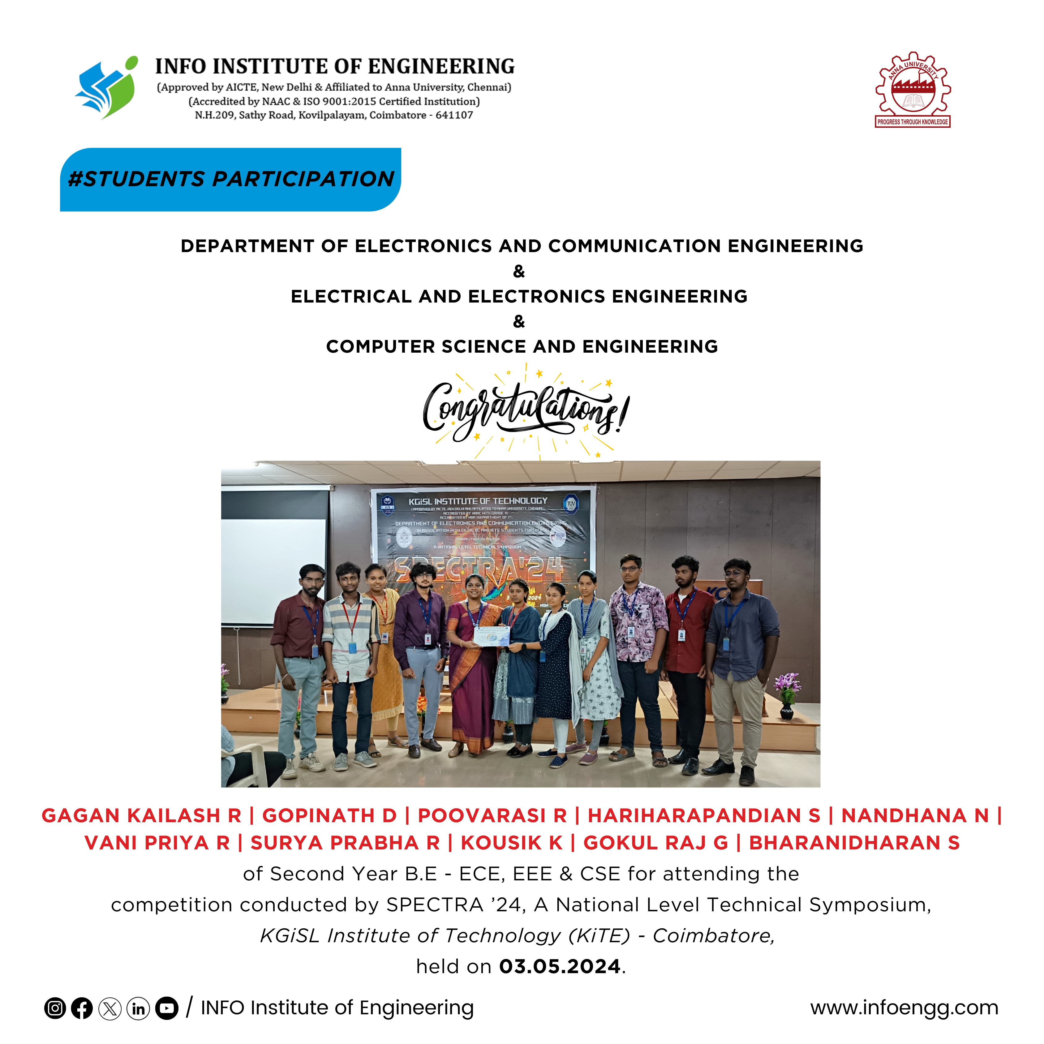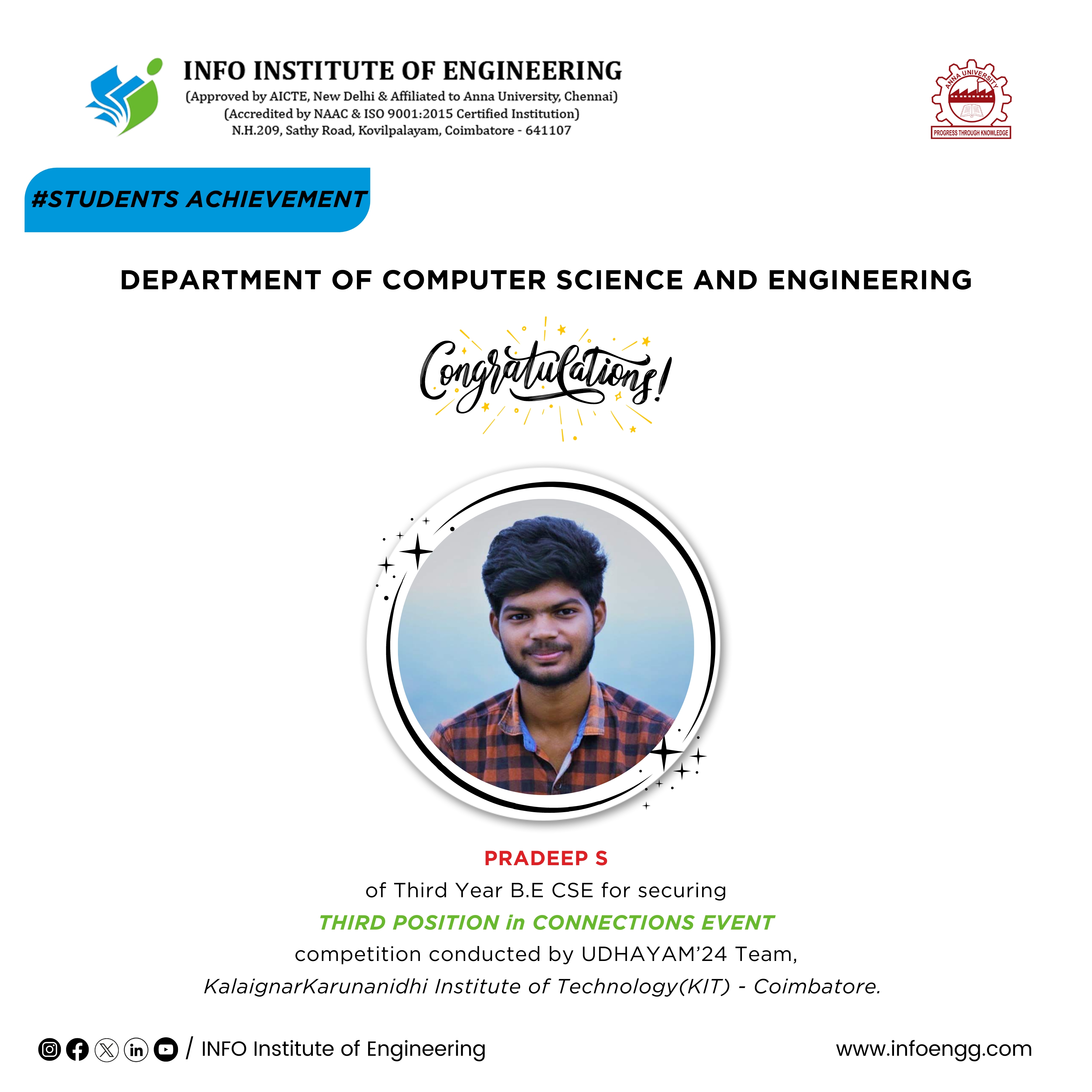 .We're thrilled to announce that our student, Pradeep S (III year CSE), showcased remarkable talent by participating in the event CONNECTIONS and securing the Third Prize at UDHAYAM'24 - An Intercollegiate Technical and Cultural Fest organized by the UDHAYAM’24 Team at Kalaignar Karunanidhi Institute of Technology(KIT), Coimbatore. Our heartfelt congratulations and kudos to Pradeep S
