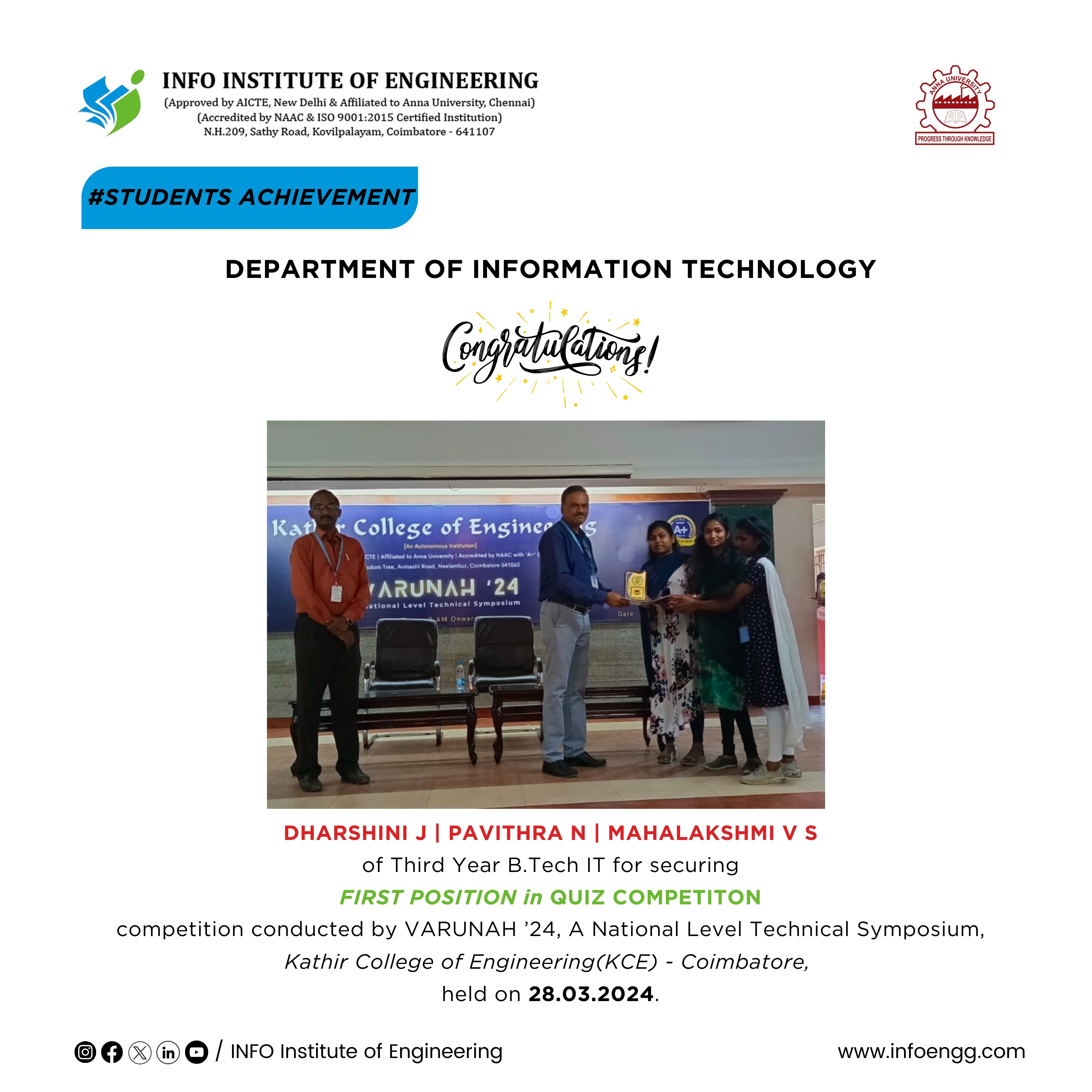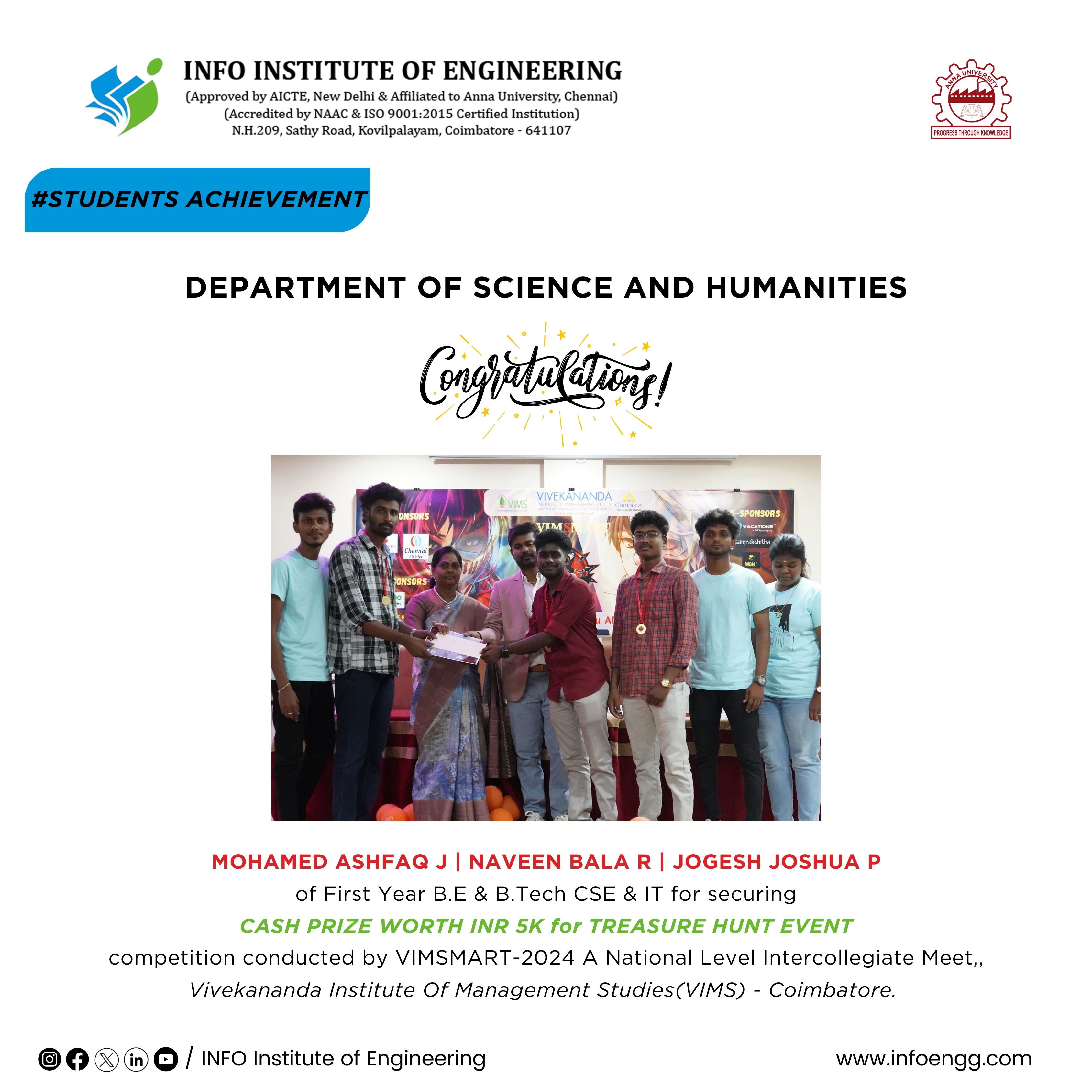 .We're excited to announce that our students, Mohamed Ashfaq J (I year CSE), Naveen Bala R (I year CSE), and Jogesh Joshua P (I year IT), displayed exceptional teamwork by participating in the Treasure Hunt Event and securing the cash prize worth INR 5K at VIMSMART-2024, a National Level Intercollegiate Meet hosted by Vivekananda Institute Of Management Studies(VIMS), Coimbatore. Congratulations to the team!