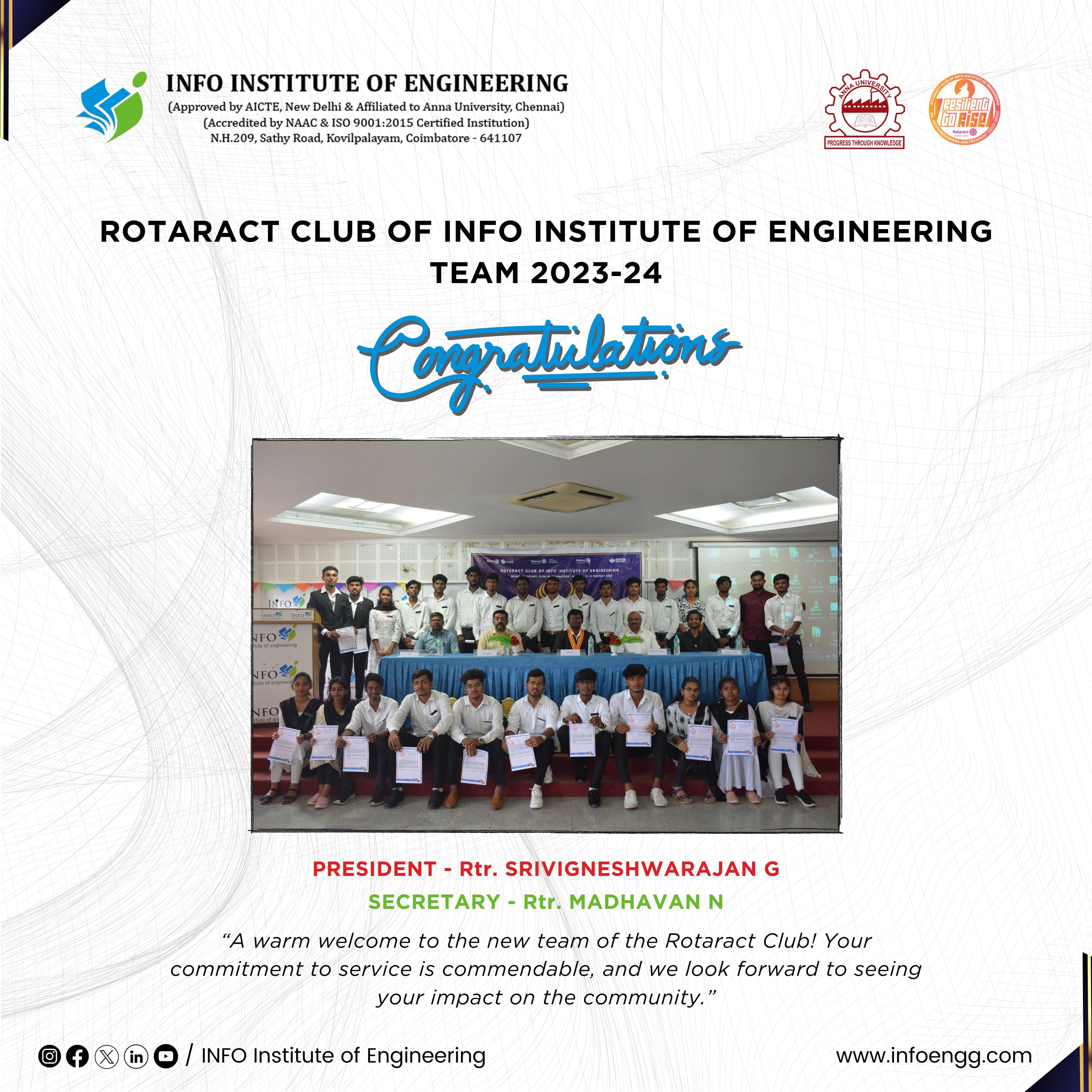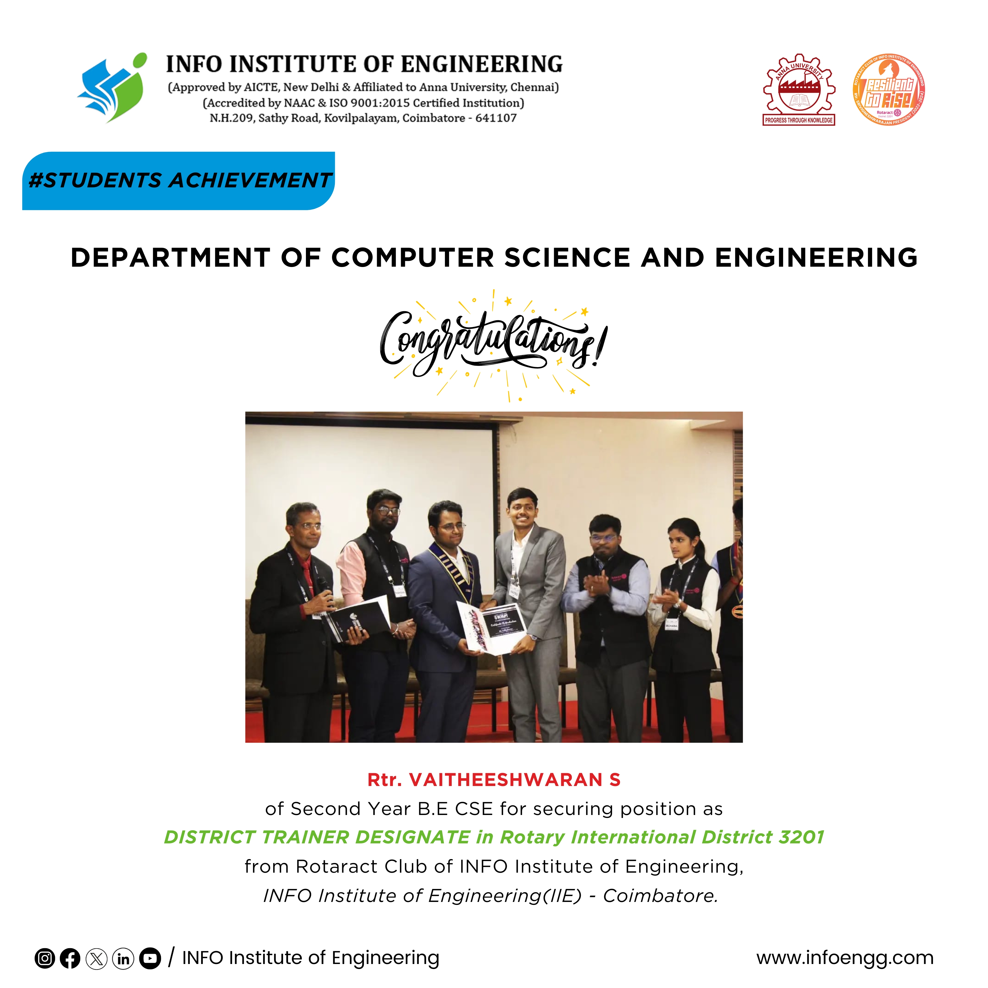 .We're thrilled to announce that our student, Rtr. Vaitheeshwaran S (II year CSE), showcased outstanding leadership skills by participating in the SCULPT - District Trainers Workshop Seminar and earning the position of District Trainer Designate from the Rotaract Club of INFO Institute of Engineering, INFO Institute of Engineering(IIE), Coimbatore. Our heartfelt congratulations and kudos to Rtr. Vaitheeshwaran!