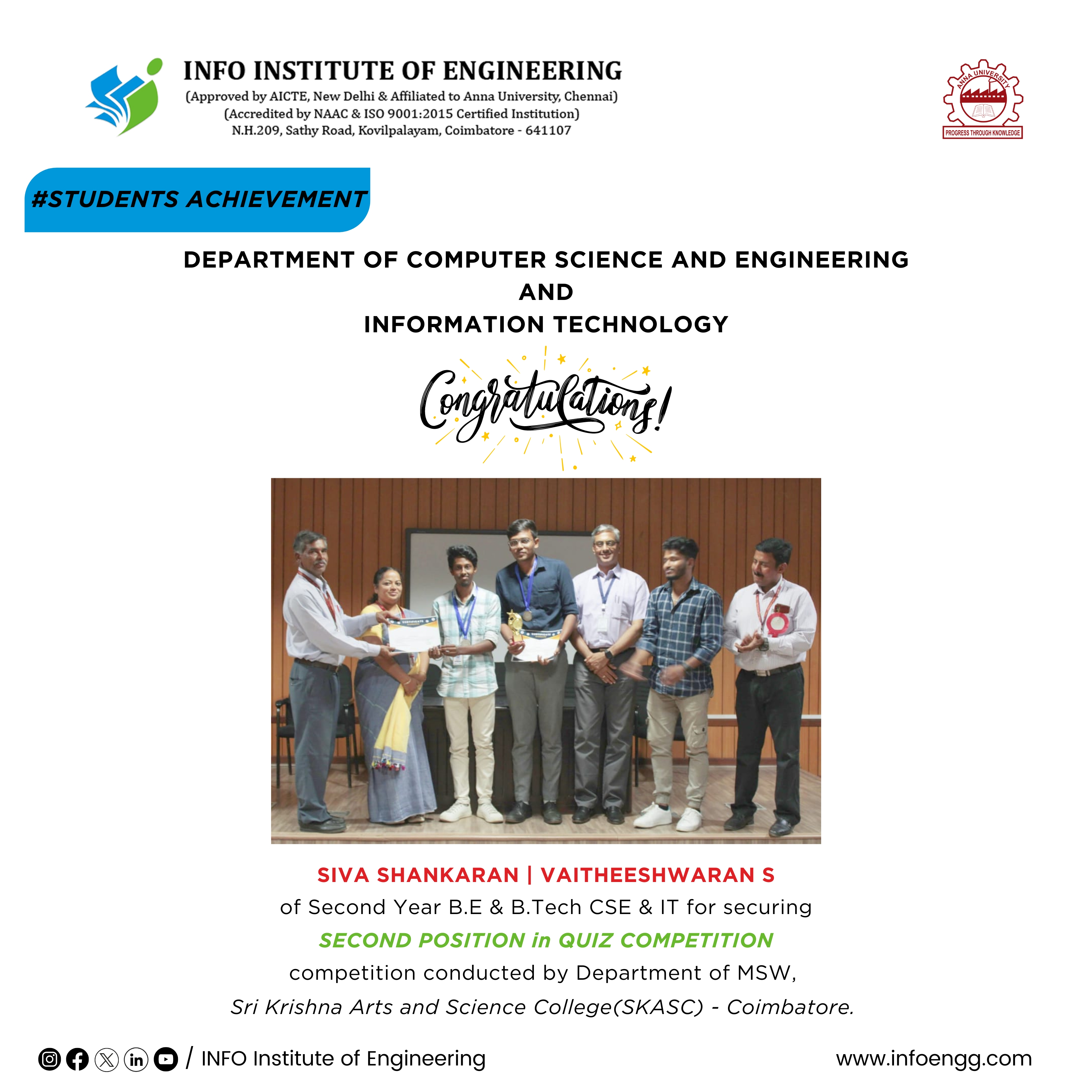 .We're thrilled to announce that our students, Vaitheeshwaran. S (II year CSE) and Sivashankaran.R (II Year IT), secured the 2nd prize in the QUIZ COMPETITION hosted by the Department of MSW at Sri Krishna College of Arts and Science, Coimbatore. Congratulations to the team!