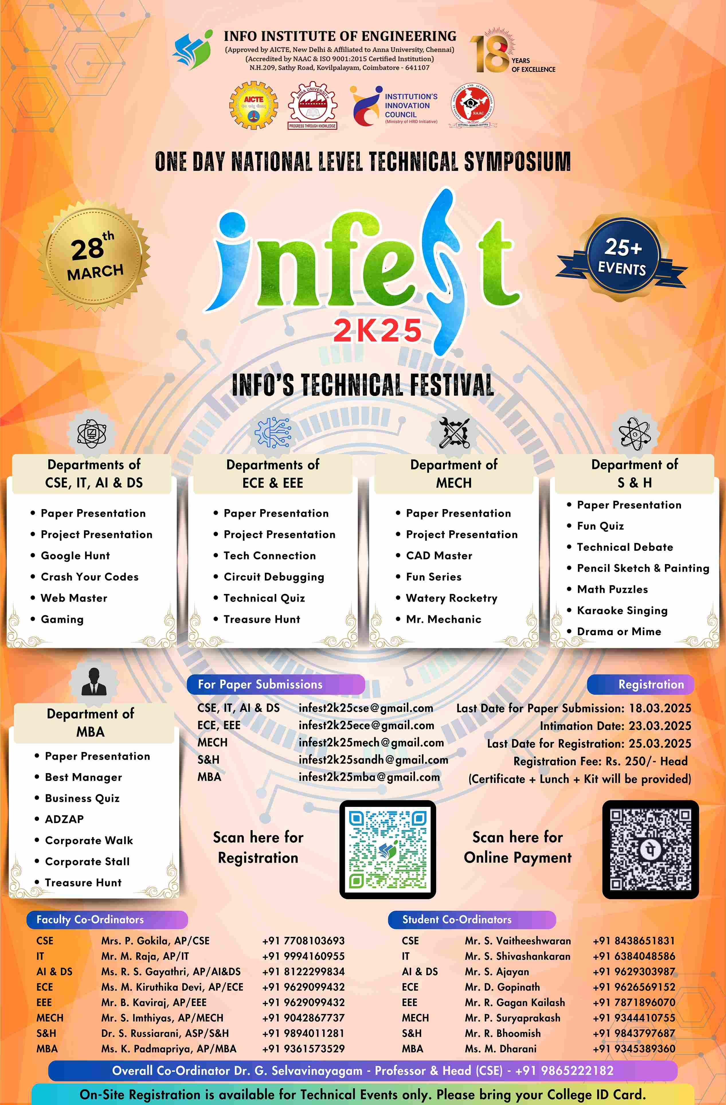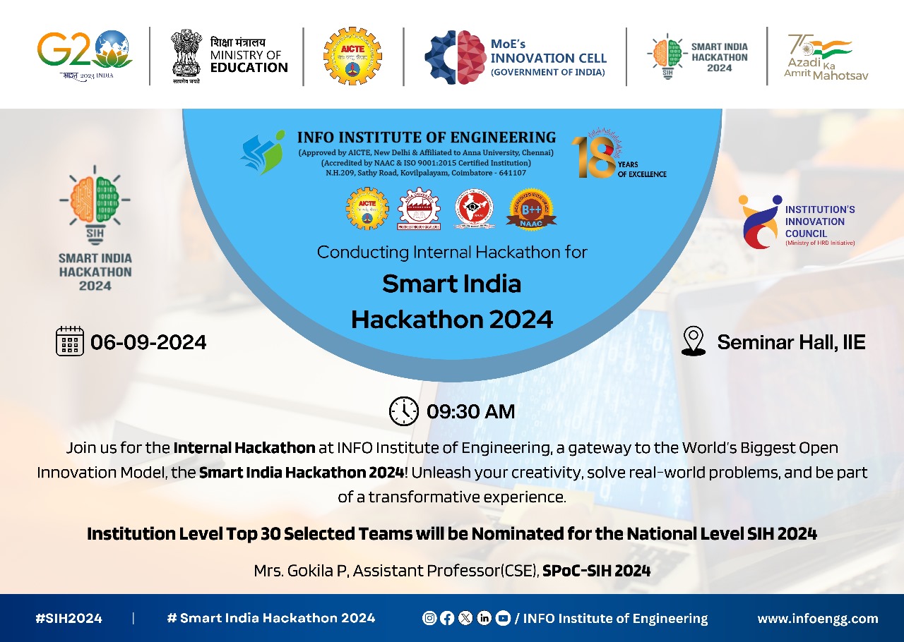 Get ready to showcase your skills at the Internal Hackathon at INFO Institute of Engineering on 24th September 2025 at 09:30 AM in the Seminar Hall on Ground Floor! This is your chance to be a part of the World’s Biggest Open Innovation Model, the Smart India Hackathon 2025.