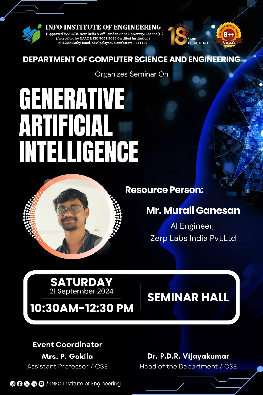 The Department of Computer Science and Engineering, INFO Institute of Engineering, is organizing a hands-on workshop on AI Tools to empower students with the skills to explore, understand, and leverage the limitless potential of Artificial Intelligence.
